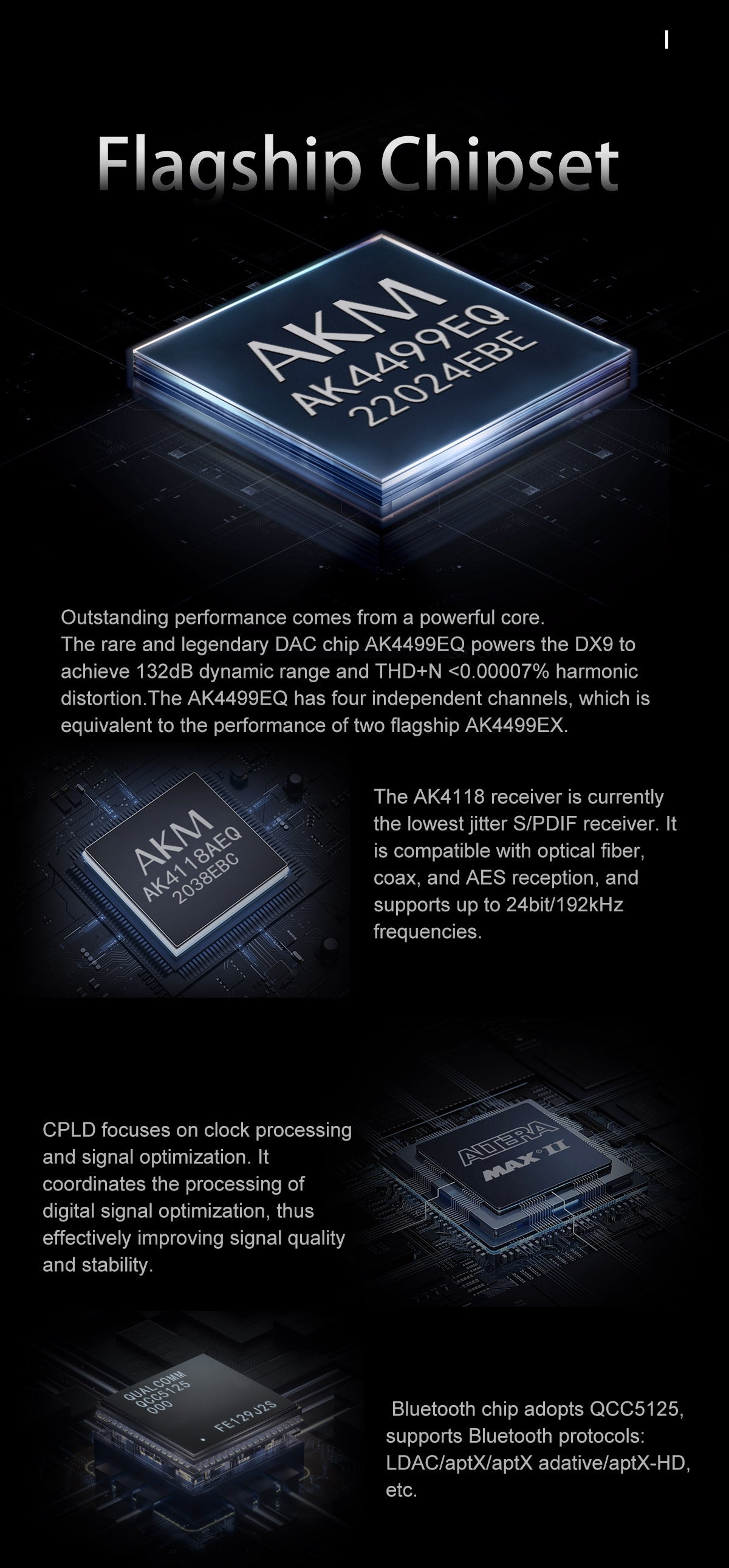 - The heart of the DX9 is the prestigious AK4499EQ DAC chip, renowned for its extraordinary 132dB dynamic range and minimal harmonic distortion below 0.00007%. This chip, equivalent to having two flagship AK4499EX chips in parallel, together with the AK4118 - the lowest jitter S/PDIF receiver available - propels the DX9 into the upper echelons of audio performance