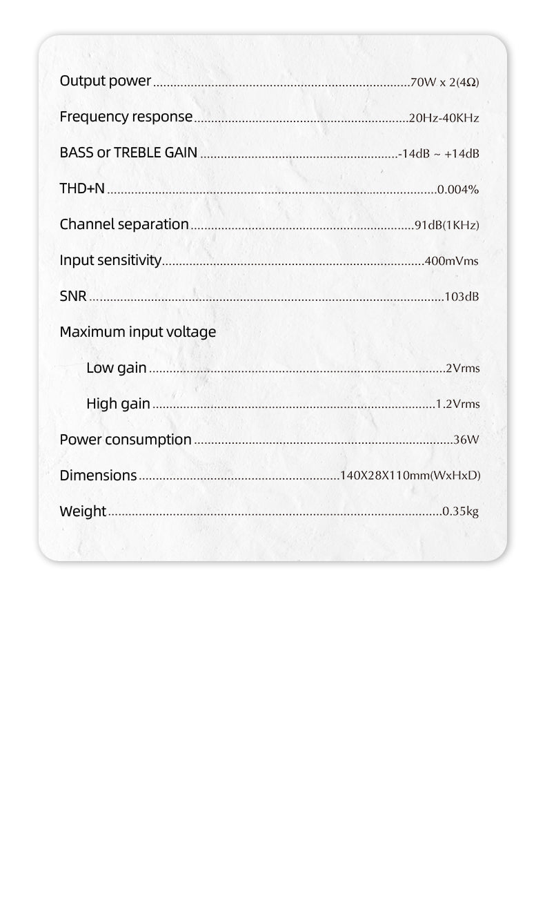 - BASS or TREBLE GAIN: -14dB ~ +14dB
